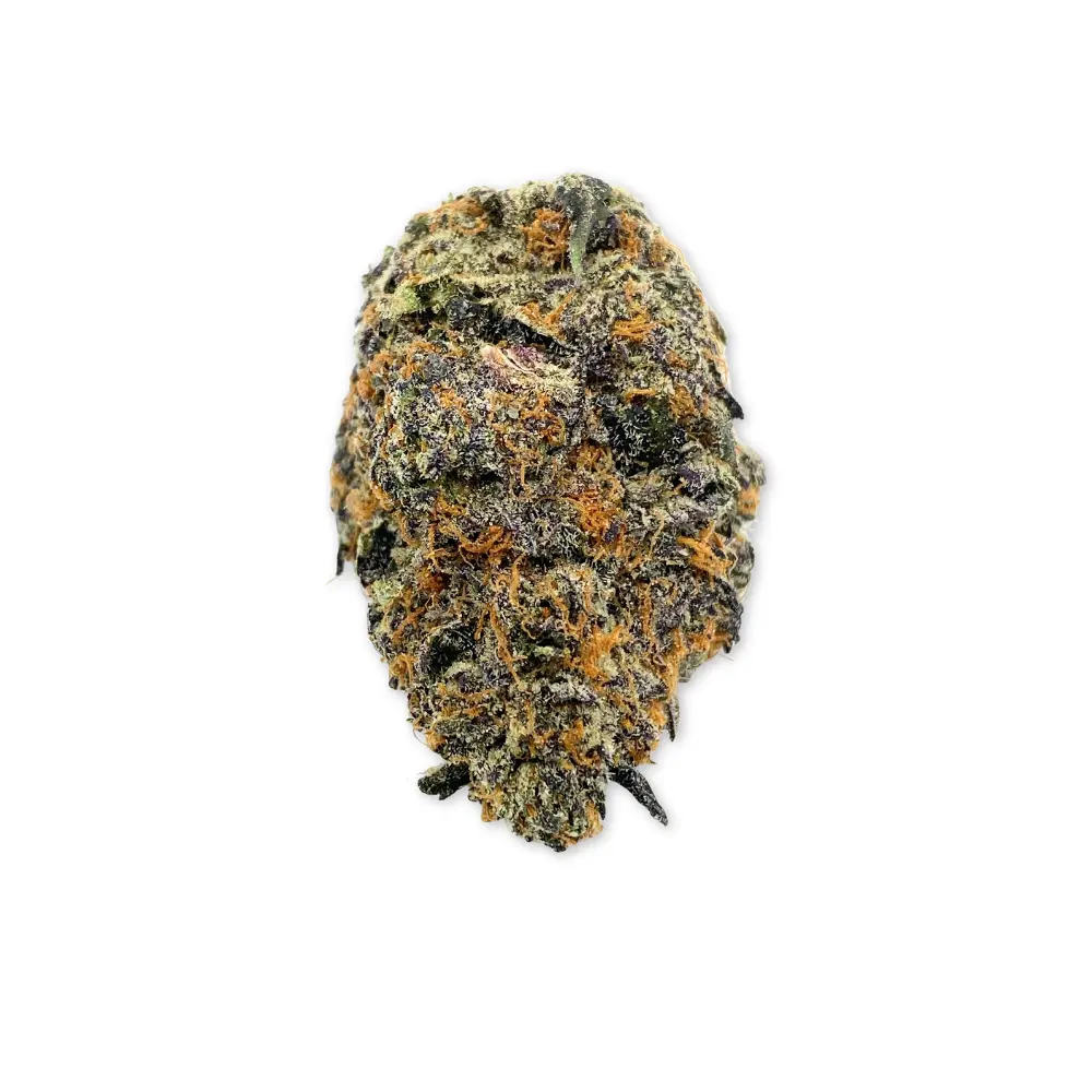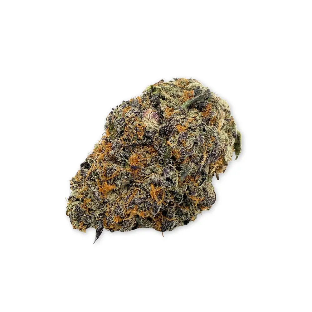 Visuals: Dense purple buds with icy trichomes and bright orange pistils