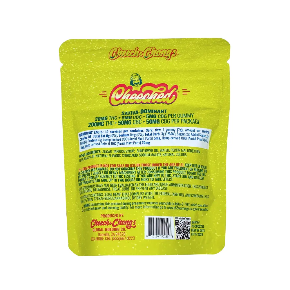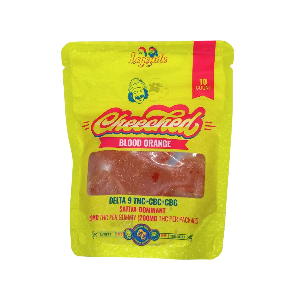 Cheeched Blood Orange Gummies are sativa-dominant, combining 20mg Delta 9, 5mg CBC, and 5mg CBG per gummy. These refreshing citrus gummies from Cheech & Chong offers 10 gummies in every pack.