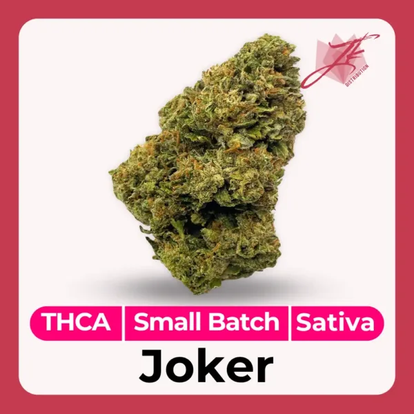 Joker THCA Flower delivers a sativa rush with 25.06% THCA and 25.92% total cannabinoids. Known for its diesel-rich nose and citrusy kick, this flower boasts bright green buds frosted with crystals and purple flecks. Its robust aroma and standout flavor profile come from a heritage likely tied to Jack Herer. Joker adds a loud, pungent twist to our Red Label roster.