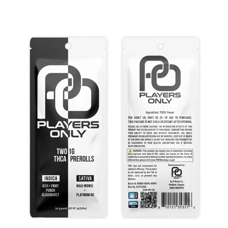 Introducing the Players Only 2ct Preroll Pouch, featuring the perfect marriage of Indica and Sativa strains. Experience the superior hand-rolled perfection and top-notch terpene quality in each preroll. One RS11 + Fruit Punch Cloudburst (Indica) and one Maui Wowie + Platinum OG (Sativa) preroll in each pouch.