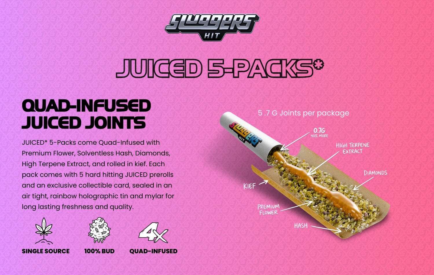 Each Juiced* 5-Pack includes five quad-infused prerolls and one collectible card. Products are sealed in an airtight holographic tin and enclosed in mylar packaging to preserve freshness and protect terpene integrity.
