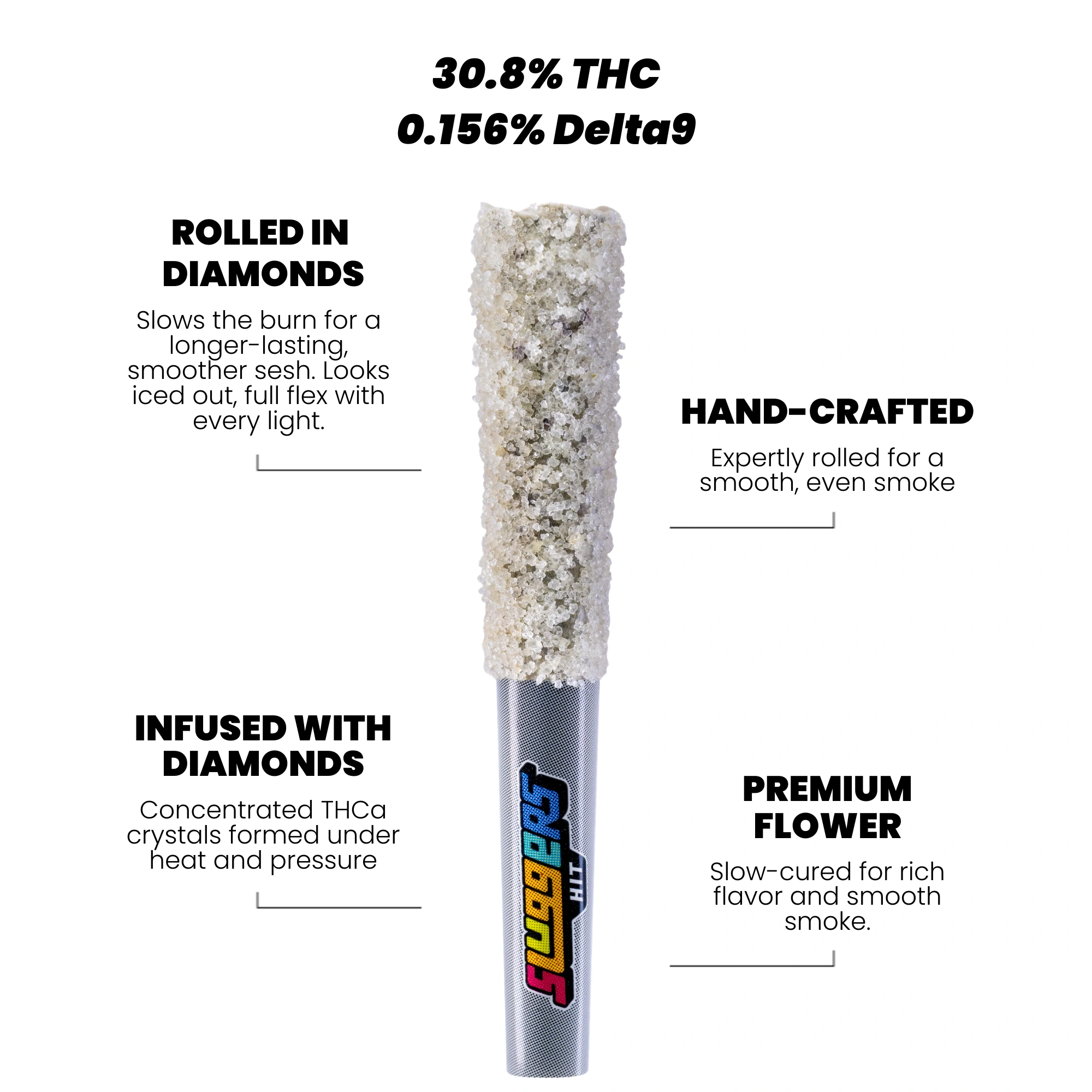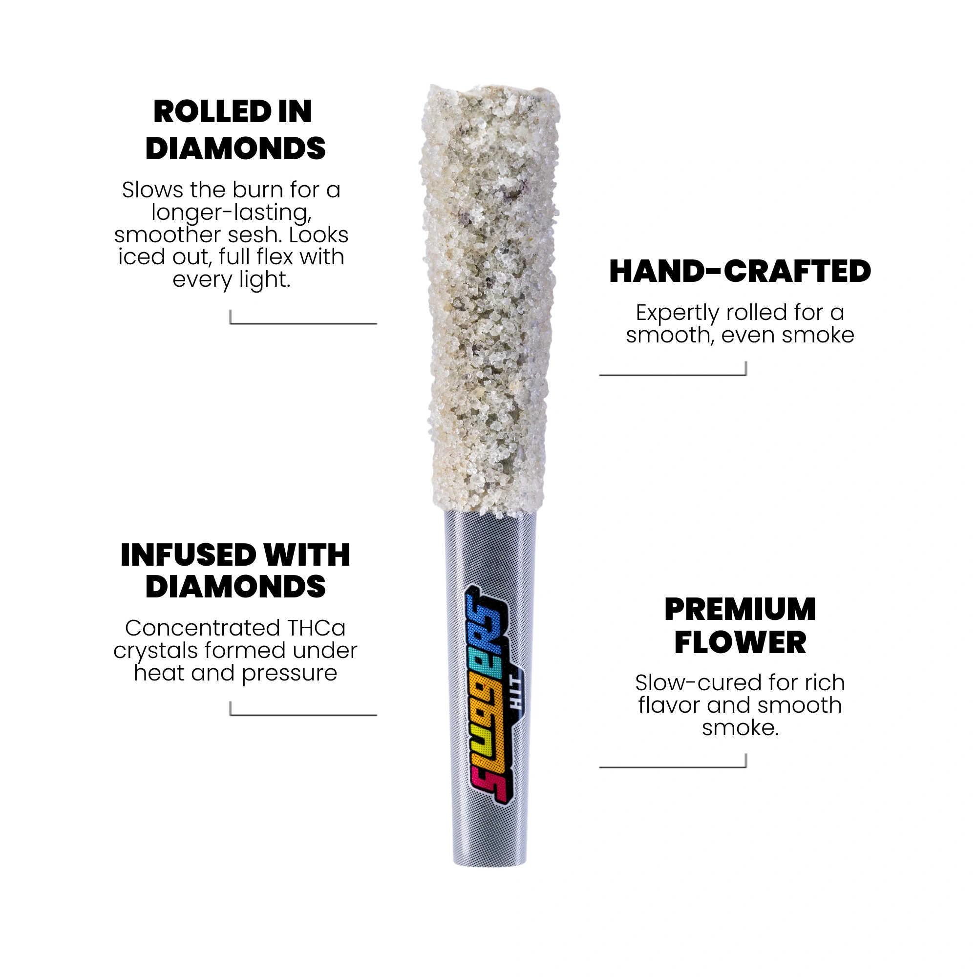 Each pack contains five quad-infused prerolls made with flower, solventless hash, THCa diamonds, and terpene extract, finished with a kief coating.
