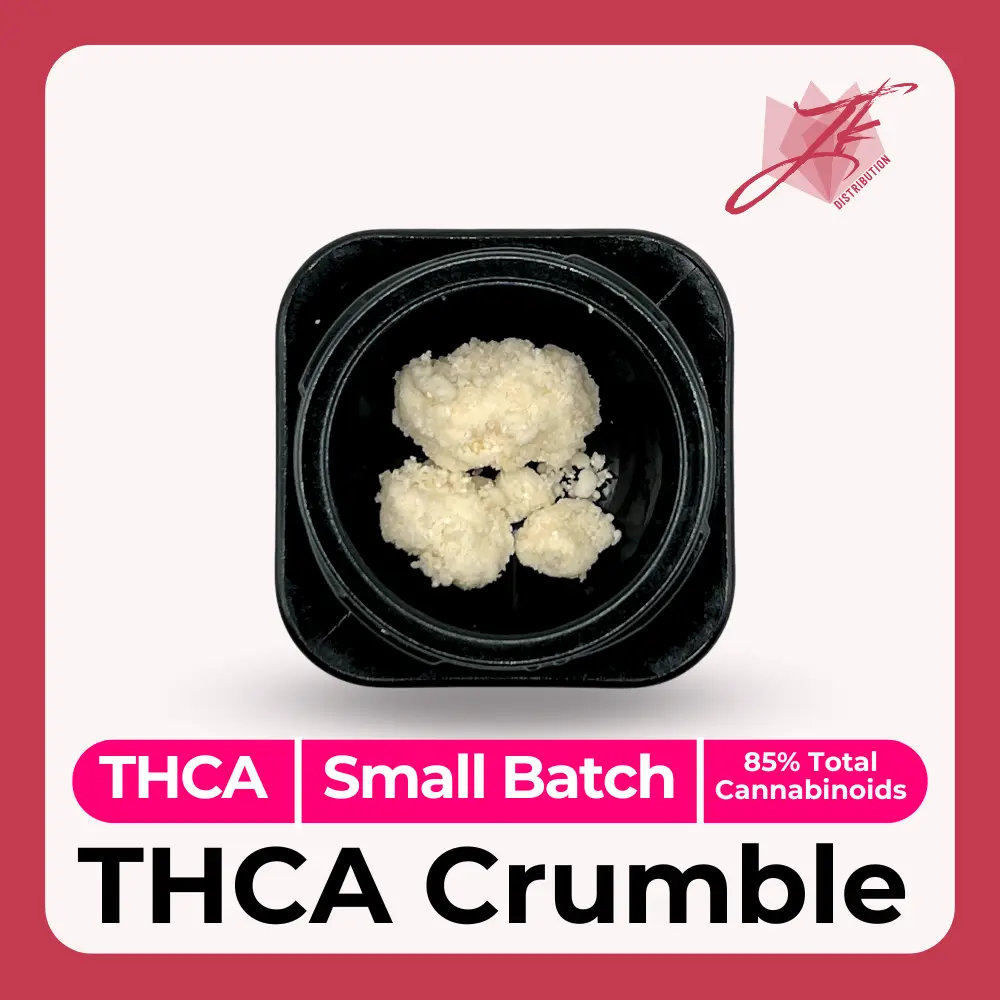 THCA Crumble, a potent concentrate that brings forth an unparalleled THCA experience. Its distinct crumbly and wax-like form ensures ease of use, whether you’re vaping, dabbing, or enhancing your joints and bowls.