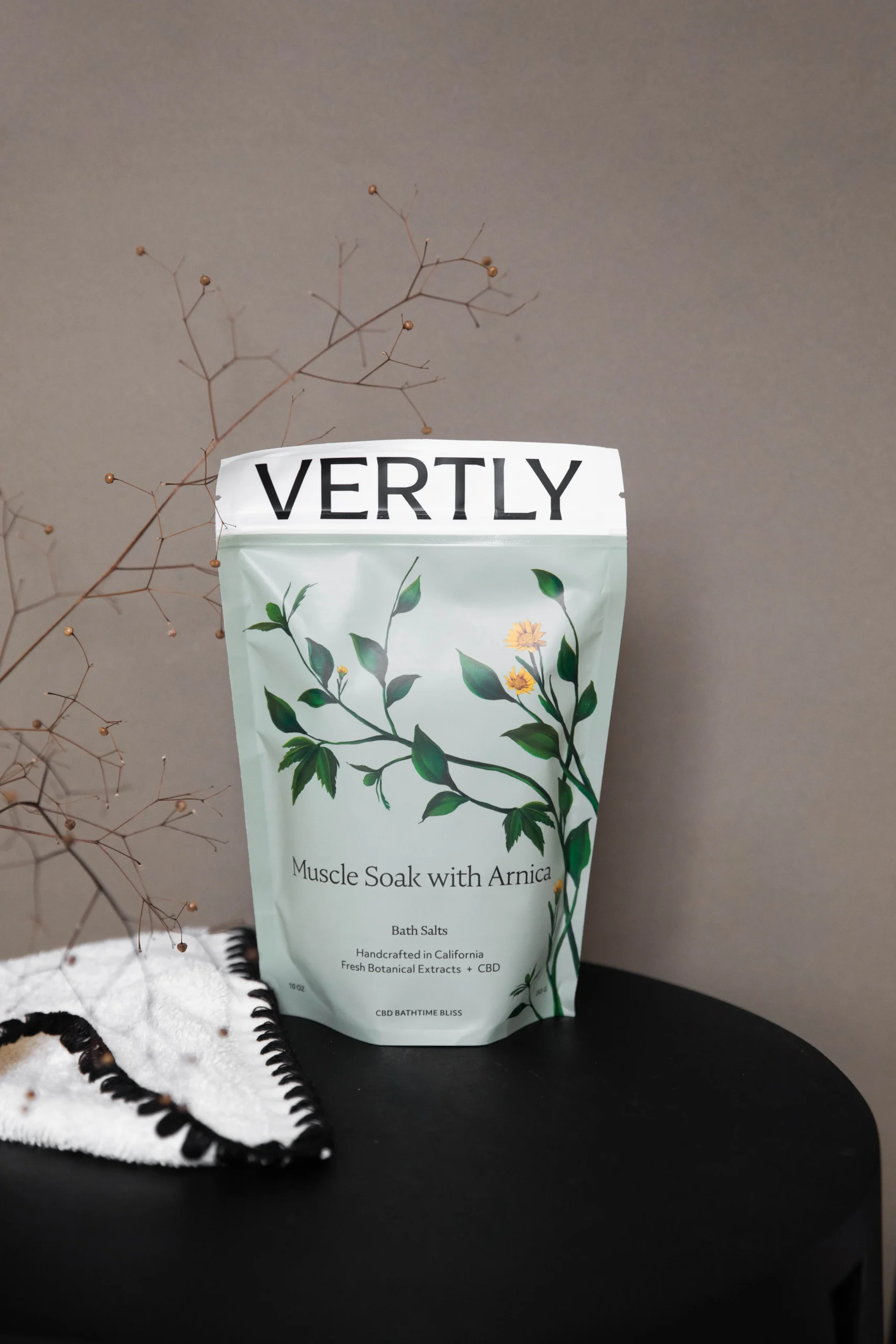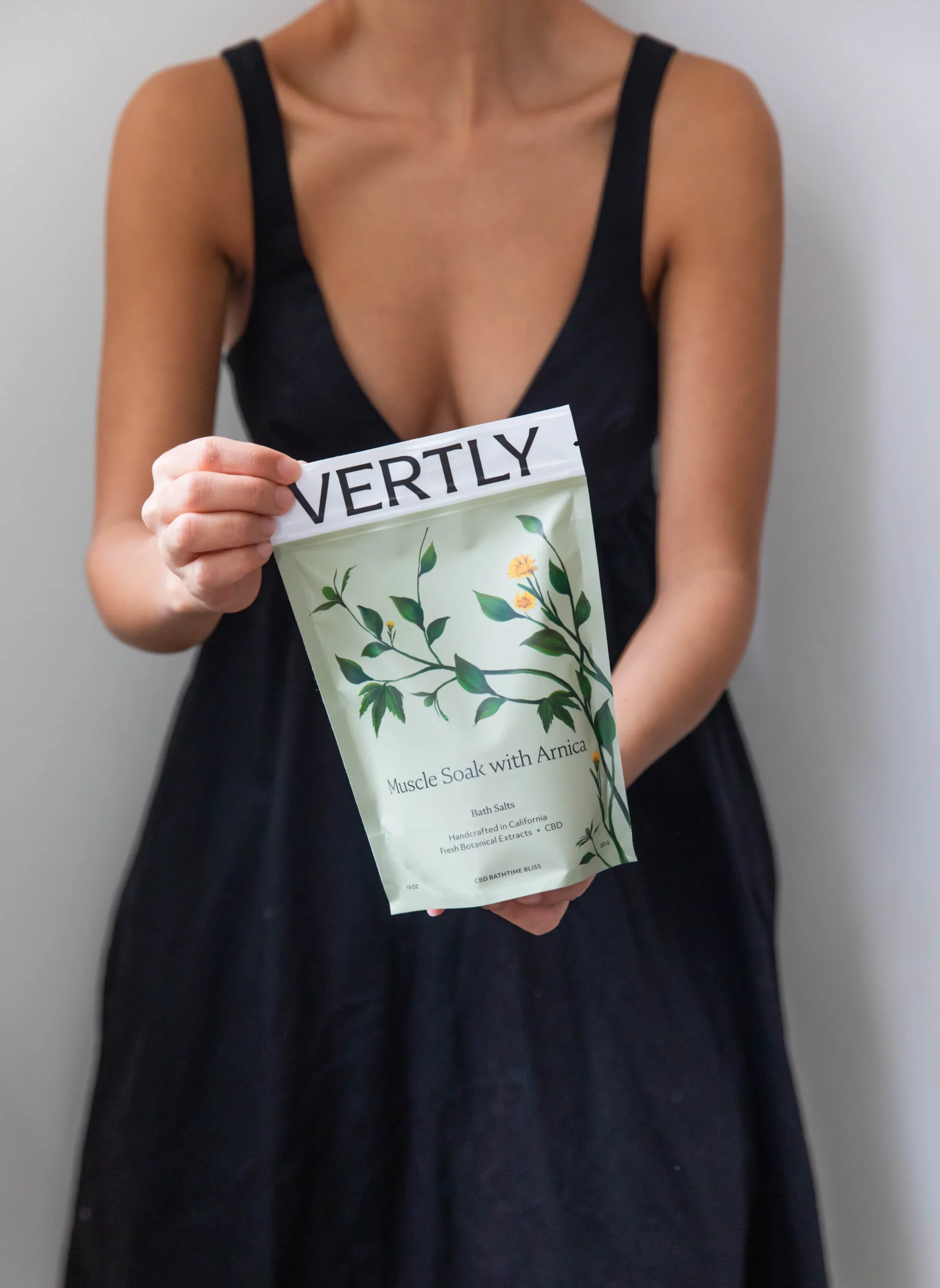Vertly Muscle Soak Bath Salts are the ultimate remedy for relaxing and rejuvenating your body. A blend of full spectrum CBD and arnica flower works together to soothe your muscles and joints while detoxifying the body and calming the mind.